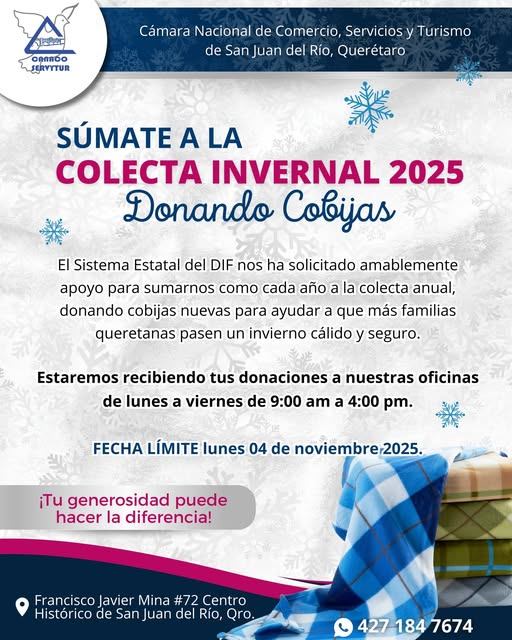 En la Cámara de Comercio de San Juan del Río, nos unimos con entusiasmo y compromiso a la Colecta Invernal 2025 del DIF Estatal, una noble iniciativa que busca llevar abrigo, esperanza y calidez a las familias queretanas que más lo necesitan durante esta temporada.