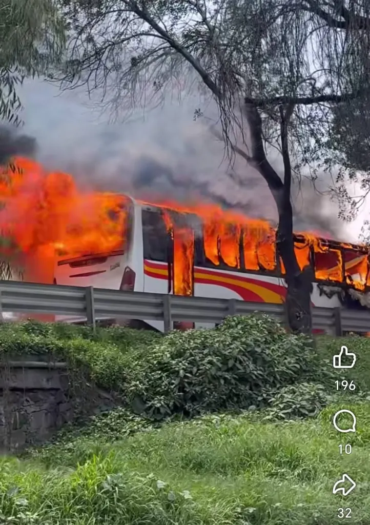 Hace unos momentos, un autobús del transporte público atropelló y mató a un motociclista en la carretera México-Querétaro, la motocicleta fue arrastrada hasta que se generó una chispa en el tanque de gasolina y explotó, lo que provocó que el camión del transporte público también explotara y ardiera en llamas.