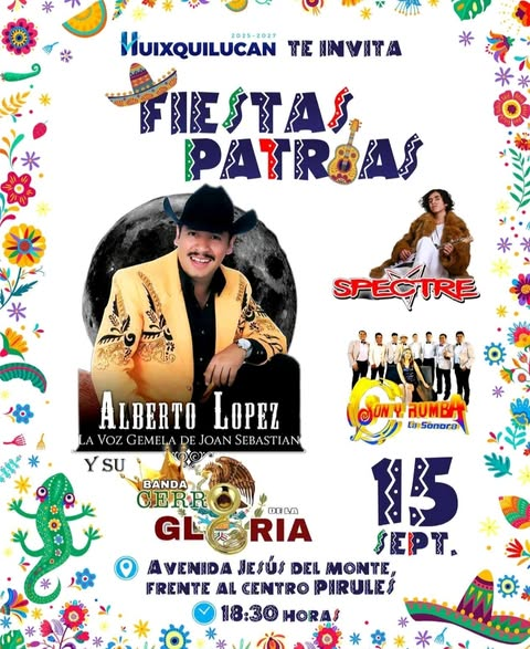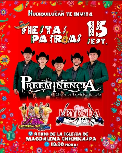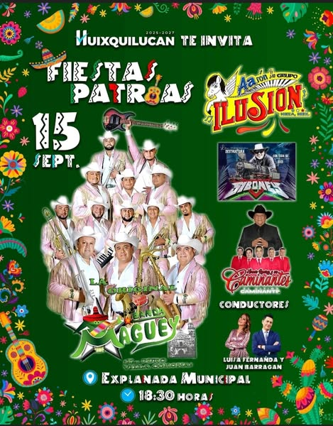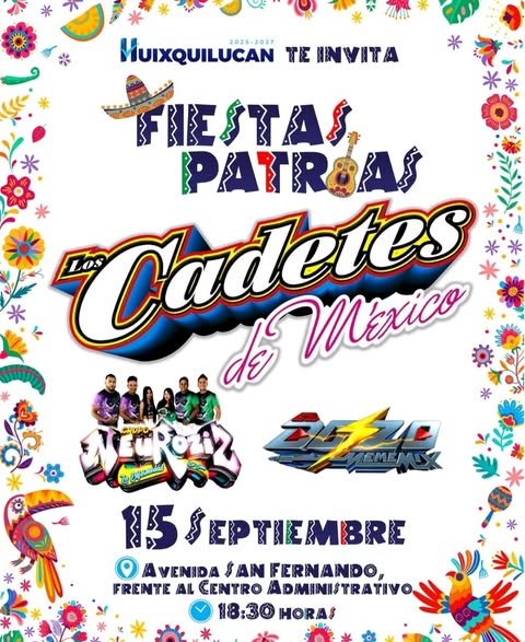Huixquilucan, Estado de México.- Con motivo del 215 Aniversario del Inicio de Independencia de México, el Gobierno de Huixquilucan invita al festejo de las “Fiestas Patrias 2025”, que se llevará a cabo este lunes 15 de septiembre en cuatro sedes, con diversas sorpresas, entre las que destaca la presencia de La Original Banda Maguey, Aarón y su Grupo Ilusión y Horacio Ramírez y sus Caminantes, entre muchas otras.