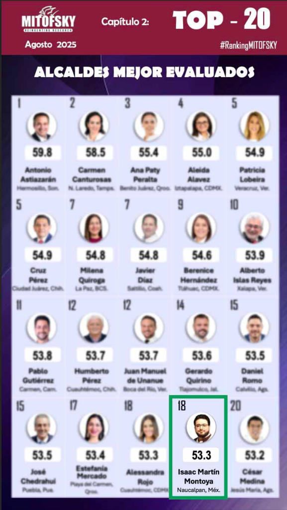 Naucalpan de Juárez, Méx., 04 de septiembre de 2025.- El alcalde de Naucalpan, Isaac Montoya Márquez, logró un ascenso histórico en el ranking de aprobación ciudadana de 150 presidentes y presidentas municipales de México del mes de agosto elaborado por Mitofsky, consolidándose como uno de los alcaldes con mayor respaldo social en el país, en el lugar 18, con un índice de aprobación del 53.3%.